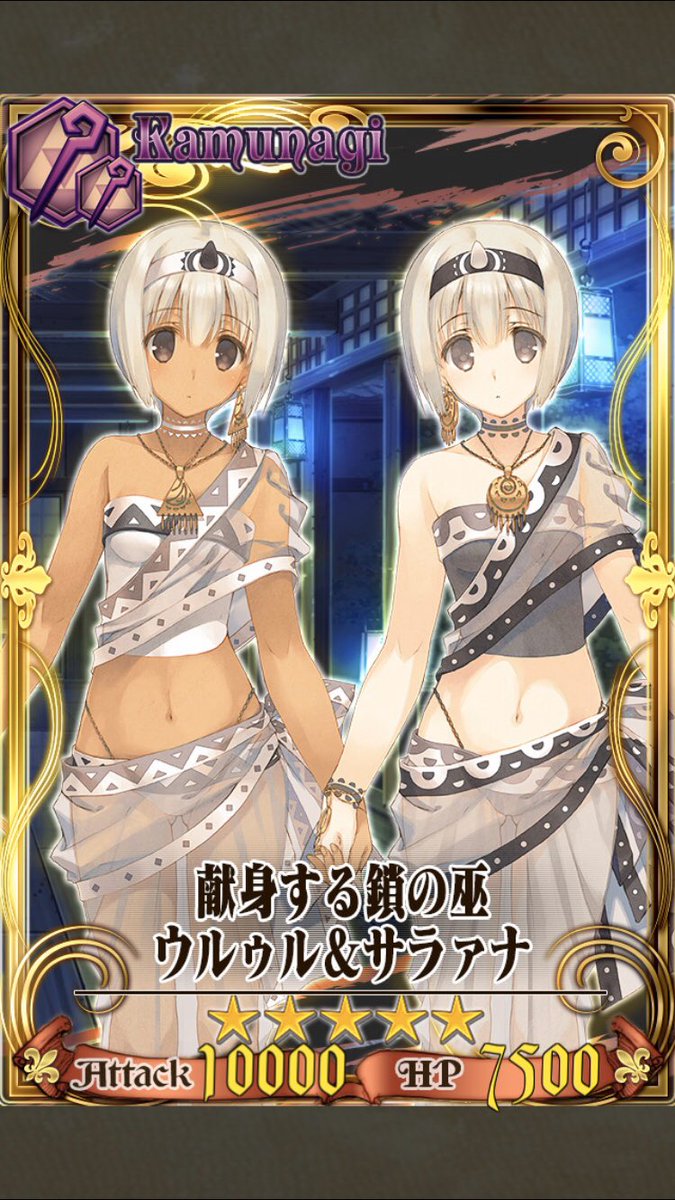 ウルゥル「わかった。」 サラァナ「主様が望むならそうします。」 ウルゥル「でも」 サラァナ「これだけは行います。」 ウルゥルとサラァナに椅子から立たされて、 ウルゥルとサラァナが俺の前に膝まずく。 ウルゥル「ウルゥル」 サラァナ「隣が姉の ウルゥルを運用する場合はこのペアが前提となるので覚えておきたい。 サラァナの弱い点 決定力不足 ウルゥルと編成することで発動するスキルは強力だが、 艦載機が2枠しか装備出来ない ので通常の航空攻撃では思ったほどの火力は出ない。 うたわれるものウルゥル・サラァナ 連撃集偽りの仮面 ゲーム ウルゥル・サラァナの連撃集です連撃は簡単なので観賞用にどうぞこの二人強すぎっす(下記内は判